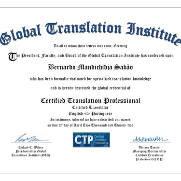 I am certified by TESOL Canada (Diploma in Translation & Interpretation) and the Certified Translation Professional (CTP) program, and I am a Certified PRO at ProZ.